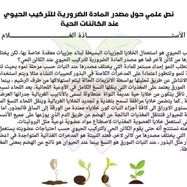 نص علمي حول مصدر المادة الضرورية لتركيب الحيوي عند الكائن الحي 1 ثانوي