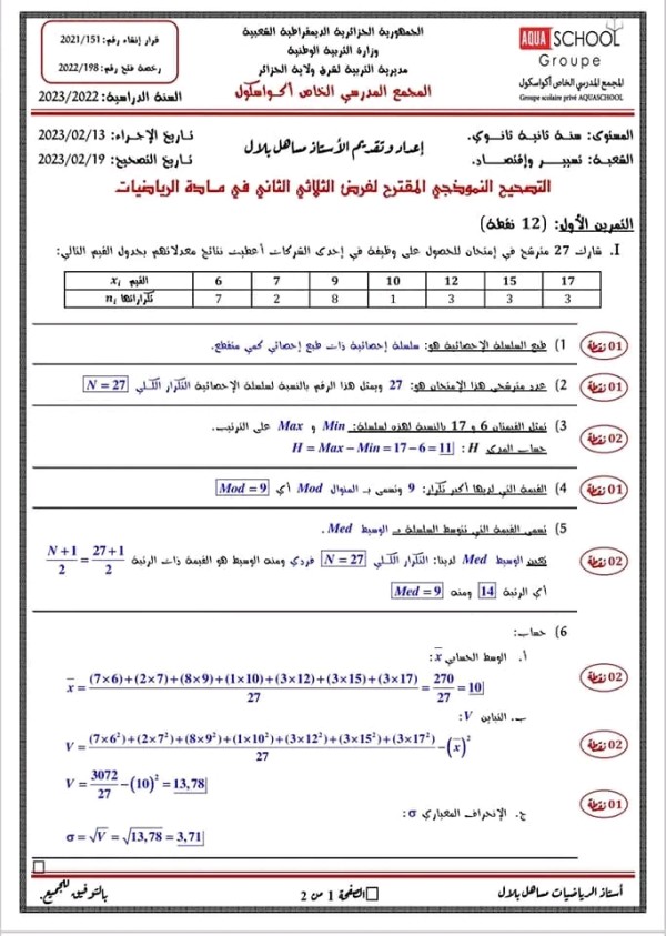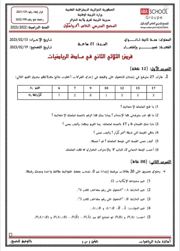 مرحباً اعزائي طلاب وطالبات في موقع باك نت يسرنا بزيارتكم أن نقدم لكم نماذج فروض مع التصحيح النموذجي للامتحانات الفصلية لجميع المواد الدراسية مرفقة بالحل للمراجعة ومعرفة كيفية الإجابة على ورقة الاختبار بمنهجية صحيحة ونموذجية كما نقدم لكم الأن أعزائي طلاب وطالبات الجمهورية الجزائرية الديمقراطية قبل اختبارات 2022 2023 نقدم لكم...فرض الفصل الثاني رياضيات سنة ثانية اداب وتسيير واقتصاد مع الحل 2023
