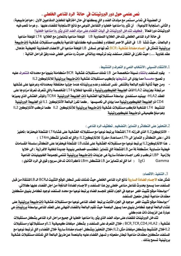 نص علمي حول دور البروتينات في حالة الرد المناعي الخلطي